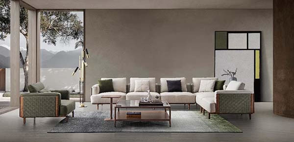 在沙发设计上,黑胡桃木与头层青牛皮高度贴合,线条感立现,双层编织皮料和滚边处理足见工匠过硬的手艺。还有以权杖、帆船为灵感设计的沙发造型,将直线与曲线的弧度拿捏到位。